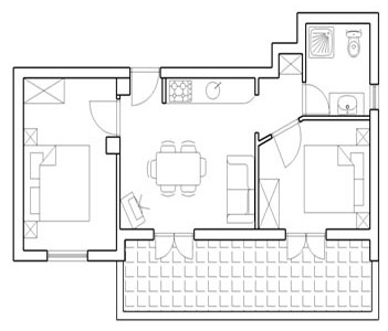 Dvije dvokrevetne sobe, kuhinja, dnevni boravak, 1 kupaonica, tuš/WC, balkon-terasa, TV, SAT, klima, perilica suđa, 4 osobe, apartman se nalazi na prvom katu. 60 m2.